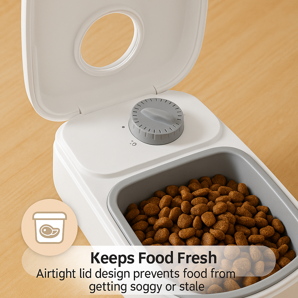 Set the feeding time and the lid opens automatically when it’s time to eat.